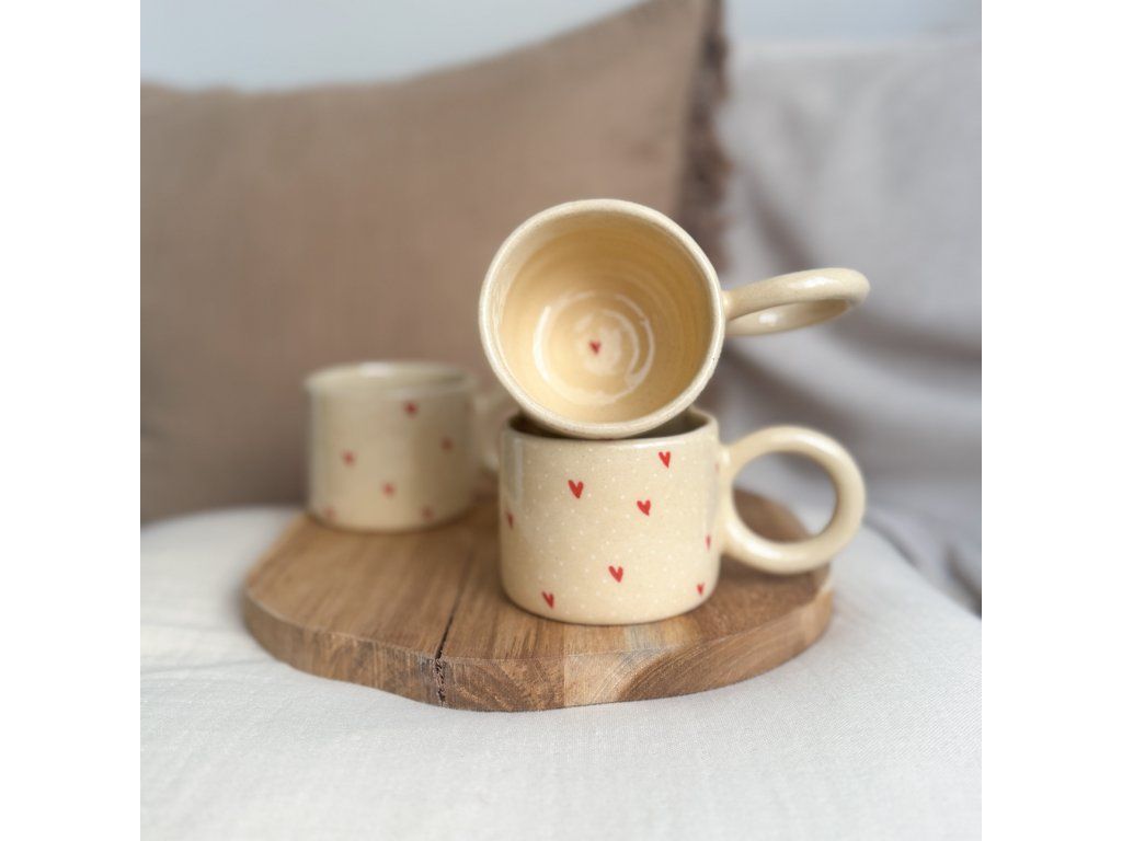 Je ručně mačkaný/modelovaný a záměrně mírně nepravidelný. Hrnek je malovaný podglazurními barvami.