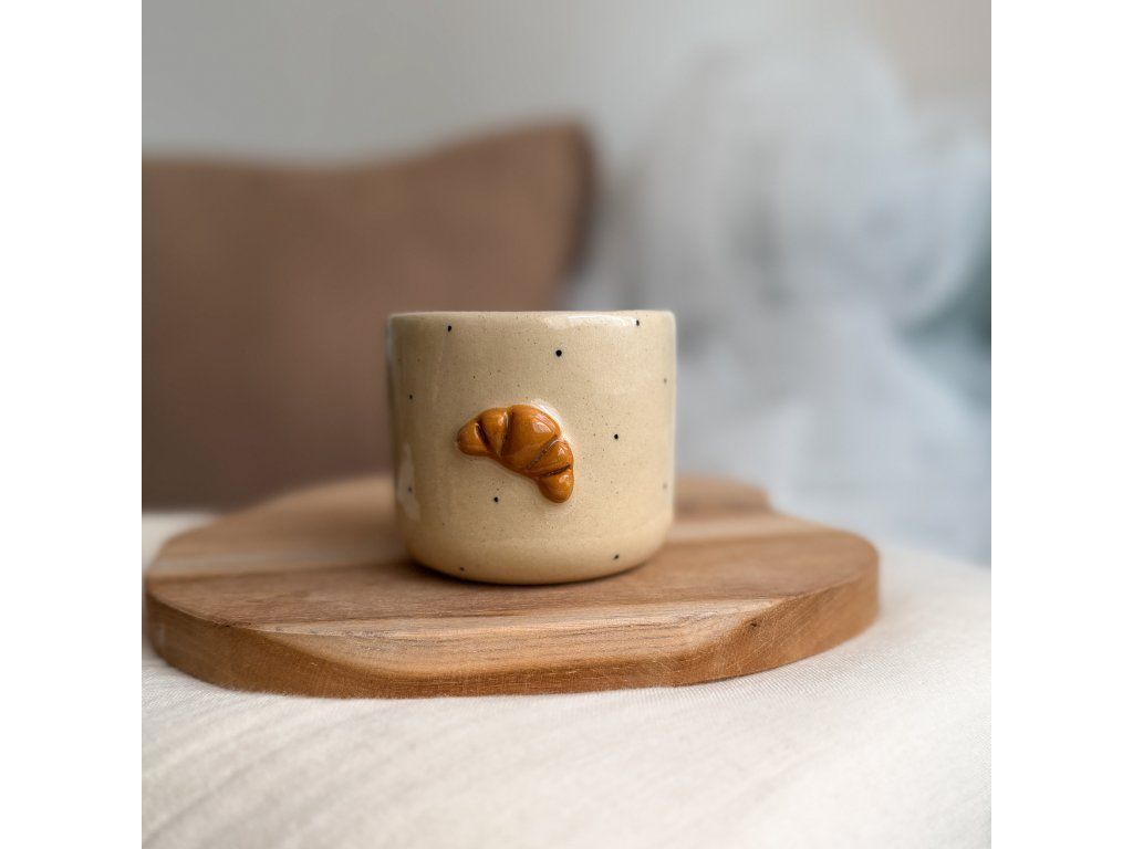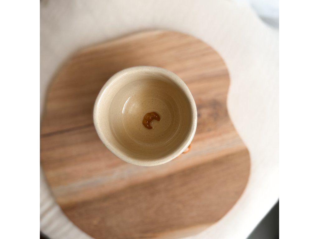 Je ručně mačkaný/modelovaný a záměrně mírně nepravidelný. Kalíšek je malovaný podglazurními barvami.