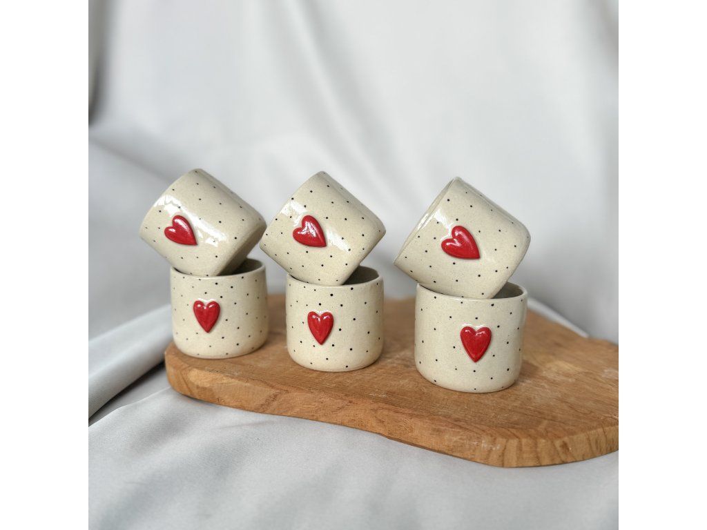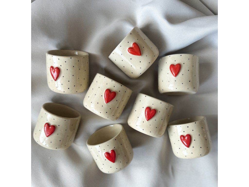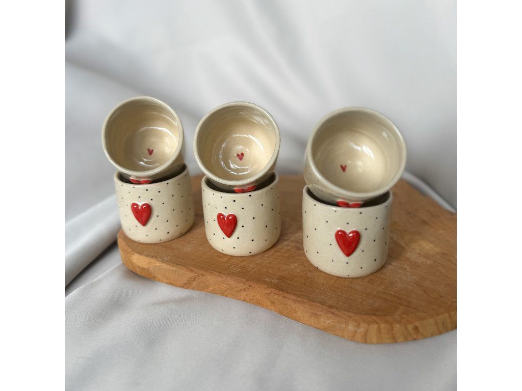 Je ručně mačkaný/modelovaný a záměrně mírně nepravidelný. Kalíšek je malovaný podglazurními barvami.