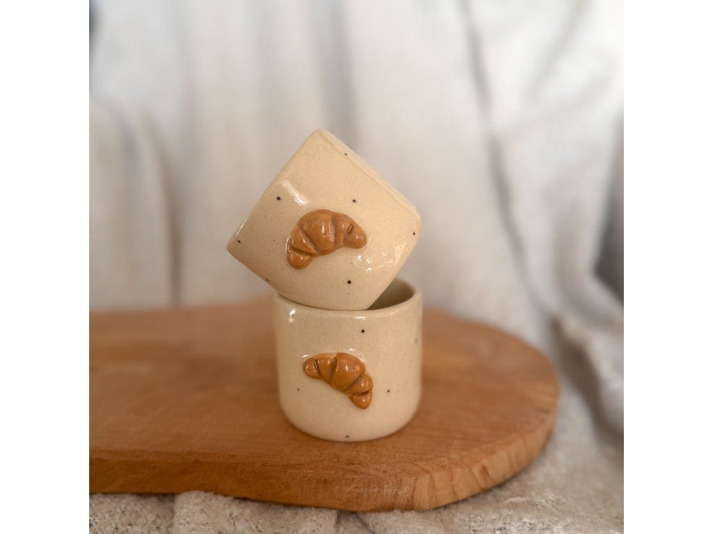 Je ručně mačkaný/modelovaný a záměrně mírně nepravidelný. Kalíšek je malovaný podglazurními barvami.