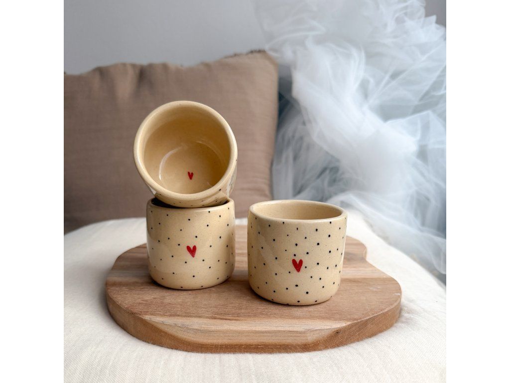 Je ručně mačkaný/modelovaný a záměrně mírně nepravidelný. Kalíšek je malovaný podglazurními barvami.