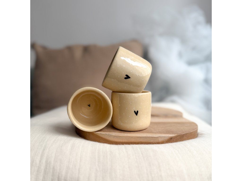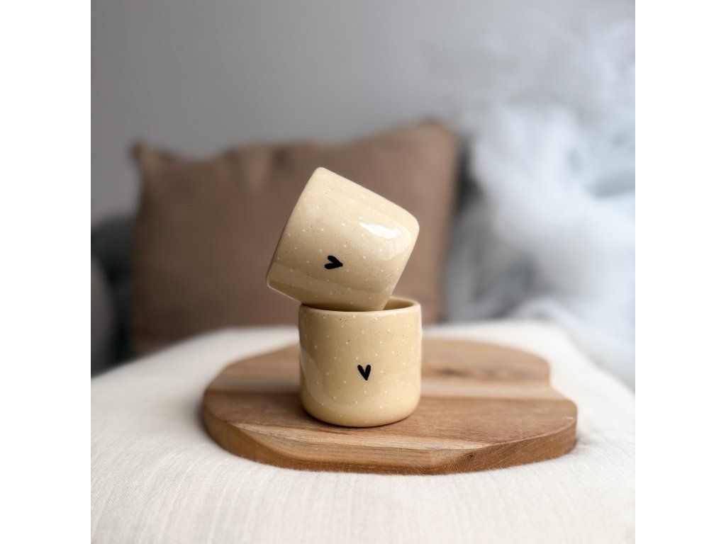 Je ručně mačkaný/modelovaný a záměrně mírně nepravidelný. Kalíšek je malovaný podglazurními barvami.