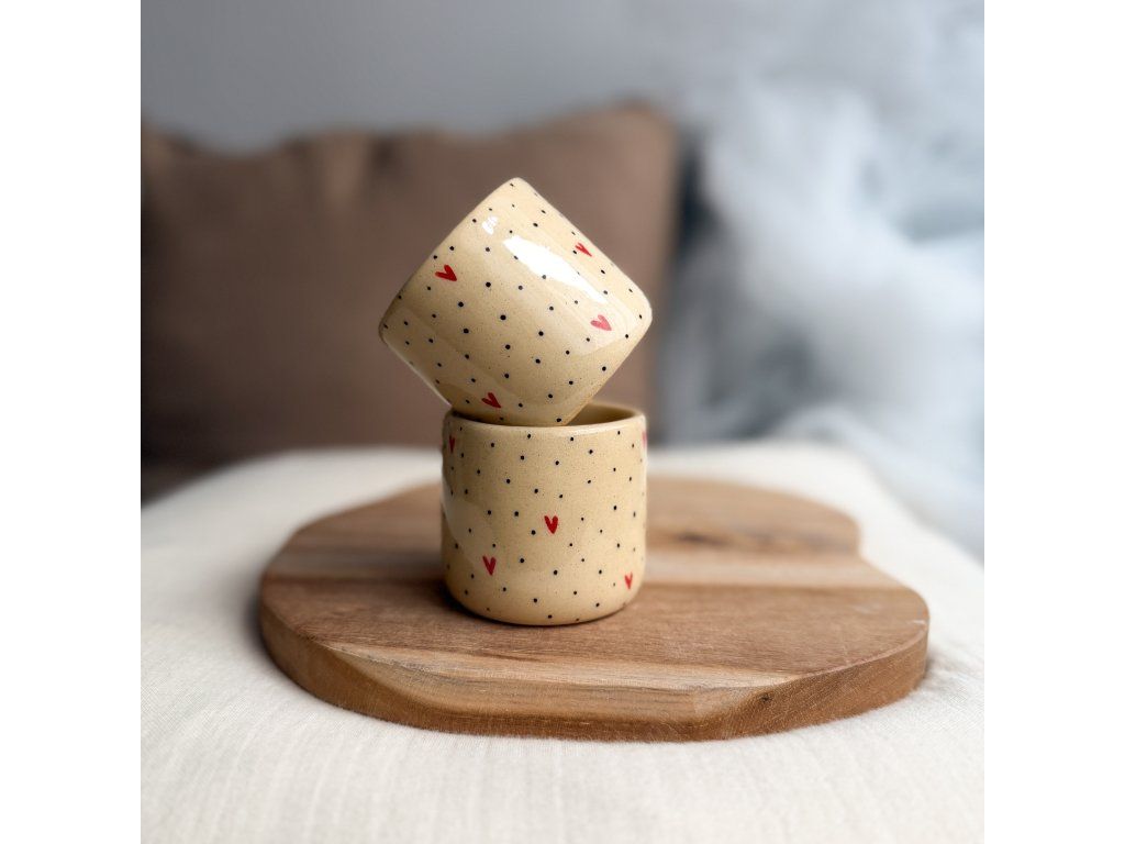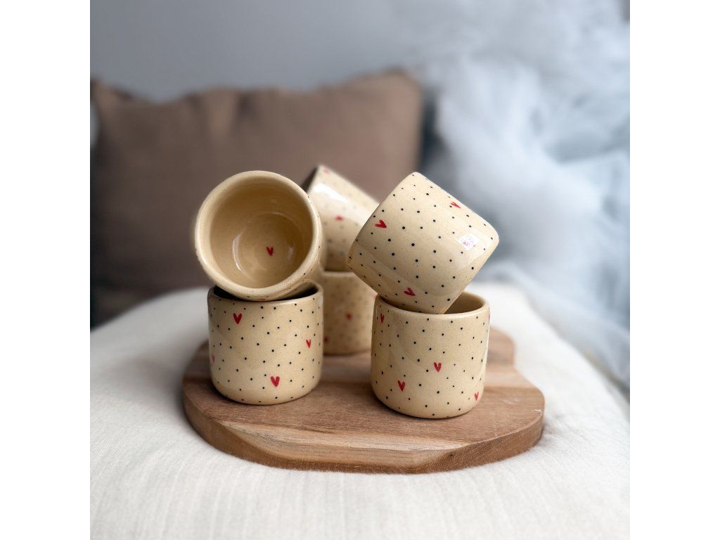 Je ručně mačkaný/modelovaný a záměrně mírně nepravidelný. Kalíšek je malovaný podglazurními barvami.
